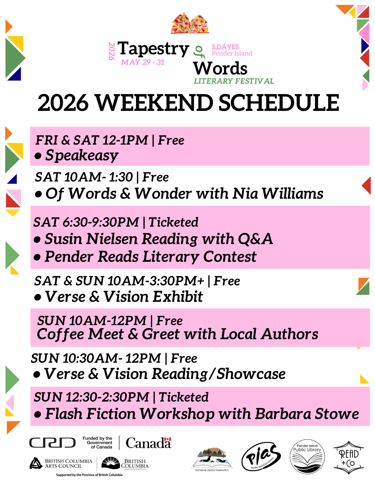 Ptarmigan Arts is proud to host our second annual Tapestry of Words: A festival celebrating story, writing, and literature. On the weekend of Friday May 29 to Sunday May 31, 2026 we are delighted to share an eclectic mix of programming for all ages and interests, some free, some ticketed. Take a look below to plan your festival!