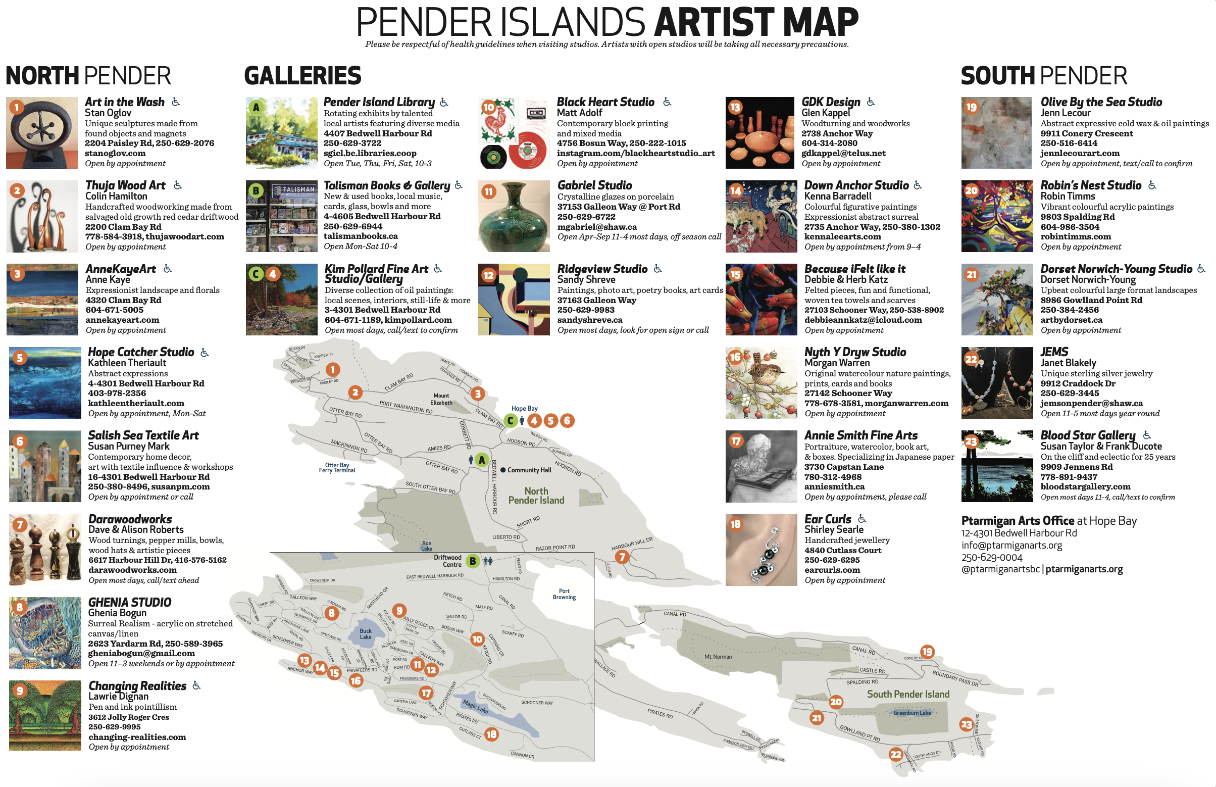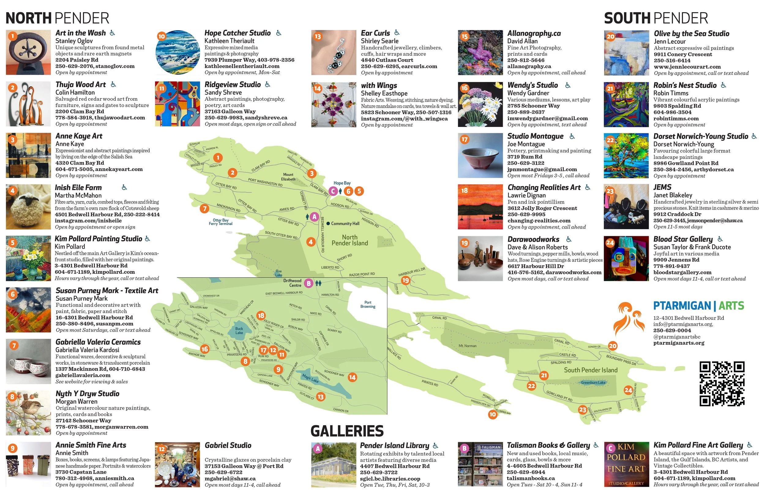 The Art Guide is distributed locally at hotels, marinas, businesses, and the Pender Chamber of Commerce info centre, as well as on BC Ferries Gulf Islands routes, Victoria to Vancouver route, and Tsawwassen Quay market.